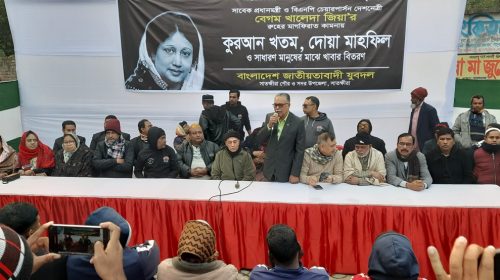 ডেস্ক রিপোর্ট: সাবেক প্রধানমন্ত্রী ও বিএনপি চেয়ারপার্সন বেগম খালেদা জিয়ার রুহের মাগফিরাত কামনায় কোরআন খতম, দোয়া মাহফিল ও সাধারণ মানুষের মাঝে খাবার বিতরণ করা হয়েছে। মঙ্গলবার (৬ জানুয়ারি) বিকালে শহরের নিউমার্কেট চত্বরে জাতীয়তাবাদী যুবদল…