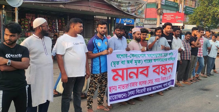 বেনাপোল প্রতিনিধি: যশোরের শার্শায় বৈষম্য বিরোধী ছাত্র আন্দোলনের উদ্যোগে যশোর-বেনাপোল মহাসড়কের দুই পাশের মৃত গাছ অপসারণের দাবিতে মানববন্ধন অনুষ্ঠিত হয়েছে।