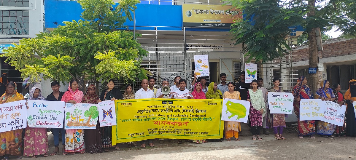 ‘প্রকৃতির সাথে সম্প্রীতি এবং টেকসই উন্নয়ন’ এই প্রতিপাদ্যে অনুষ্ঠিত মানববন্ধনে অংশগ্রহণকারীরা প্রাণবৈচিত্র্য সুরক্ষার দাবিতে ‘লবণ পানির আগ্রাসন থেকে উপকূলের প্রাণ ও প্রকৃতি বাঁচাও’, ‘উপকূলীয় এলাকায় লবণ পানি উত্তোলন বন্ধ কর, প্রাকৃতিক জলাশয় উন্মুক্ত কর’, ‘লবণ পানির চিংড়ি চাষে জোনিং সিস্টেম চালু কর’, ‘কৃষিকে বাঁচাতে সেচ উপযোগী মিষ্টি পানির ব্যবস্থা কর’, ‘ব্যাঙ বাঁচাই প্রকৃতি বাঁচাই’, ‘উপকূলীয় এলাকায় বেড়িবাঁধ রক্ষার্থে বনায়নের উদ্যোগ গ্রহণ কর’, ‘বৃক্ষ নিধন বন্ধ কর’, ‘প্রাণবৈচিত্র্য রক্ষায় জনপরিকল্পনা চাই’, ‘বাঁচার জন্য বন চাই- সুন্দরবন নিধন নয়’, ‘অবাধে কীটপতঙ্গ ধ্বংস বন্ধ করতে হবে, প্রকৃতির লাঙল কেঁচো রক্ষা কর’, ‘রাসায়নিক কীটনাশক বন্ধ করি’, ‘উপকূলীয় বীজ বৈচিত্র্য রক্ষা করি’ প্রভৃতি স্লোগান সম্বলিত প্লাকার্ড প্রদর্শন করেন।