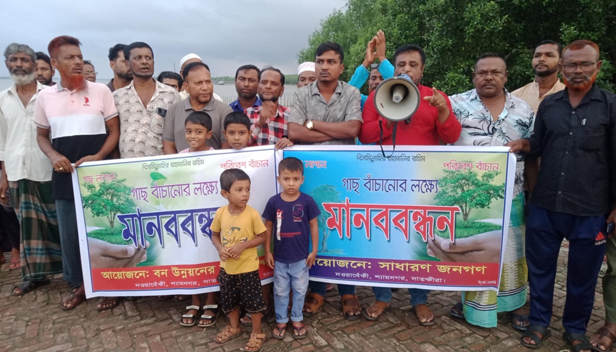 সুলতান শাহাজান, শ্যামনগর: সাতক্ষীরার শ্যামনগরের খোলপেটুয়া নদীর চর বনায়নের গাছ কেটে চর দখলের চেষ্টার প্রতিবাদে মানববন্ধন করেছে এলাকাবাসী।