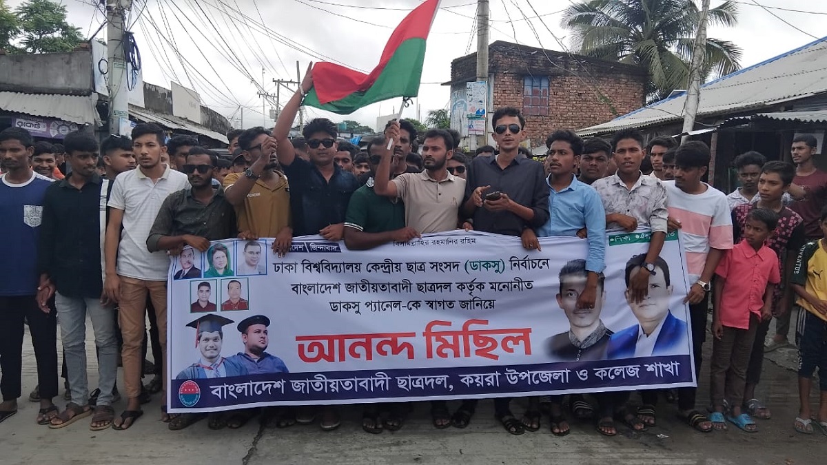 কয়রা (খুলনা) প্রতিনিধি: ঢাকা বিশ্ববিদ্যালয় কেন্দ্রীয় ছাত্র সংসদ (ডাকসু) নির্বাচনে বাংলাদেশ জাতীয়তাবাদী ছাত্রদল সমর্থিত প্যানেলকে স্বাগত জানিয়ে খুলনার কয়রা উপজেলা ছাত্রদল ও কলেজ ছাত্রদলের উদ্যোগে আনন্দ মিছিল অনুষ্ঠিত হয়েছে।