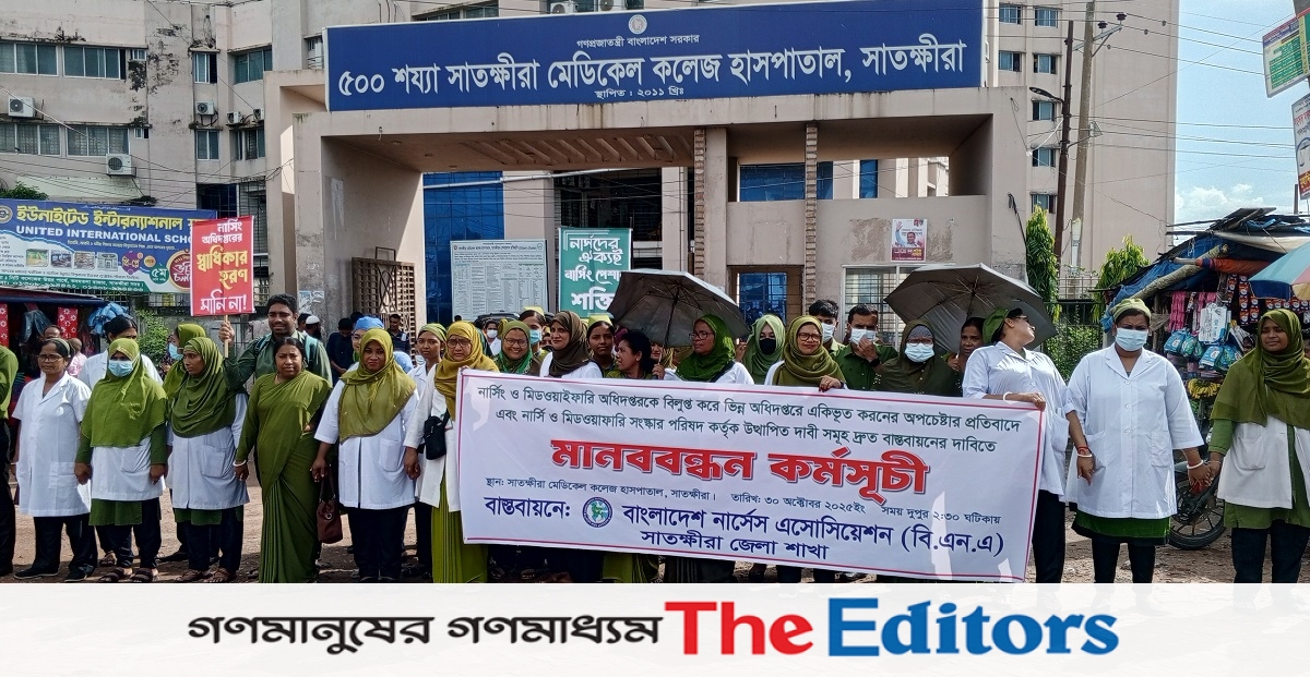 বৃহস্পতিবার (৩০ অক্টোবর) দুপুরে সাতক্ষীরা মেডিকেল কলেজ হাসপাতালের সামনে এই মানববন্ধন অনুষ্ঠিত হয়।