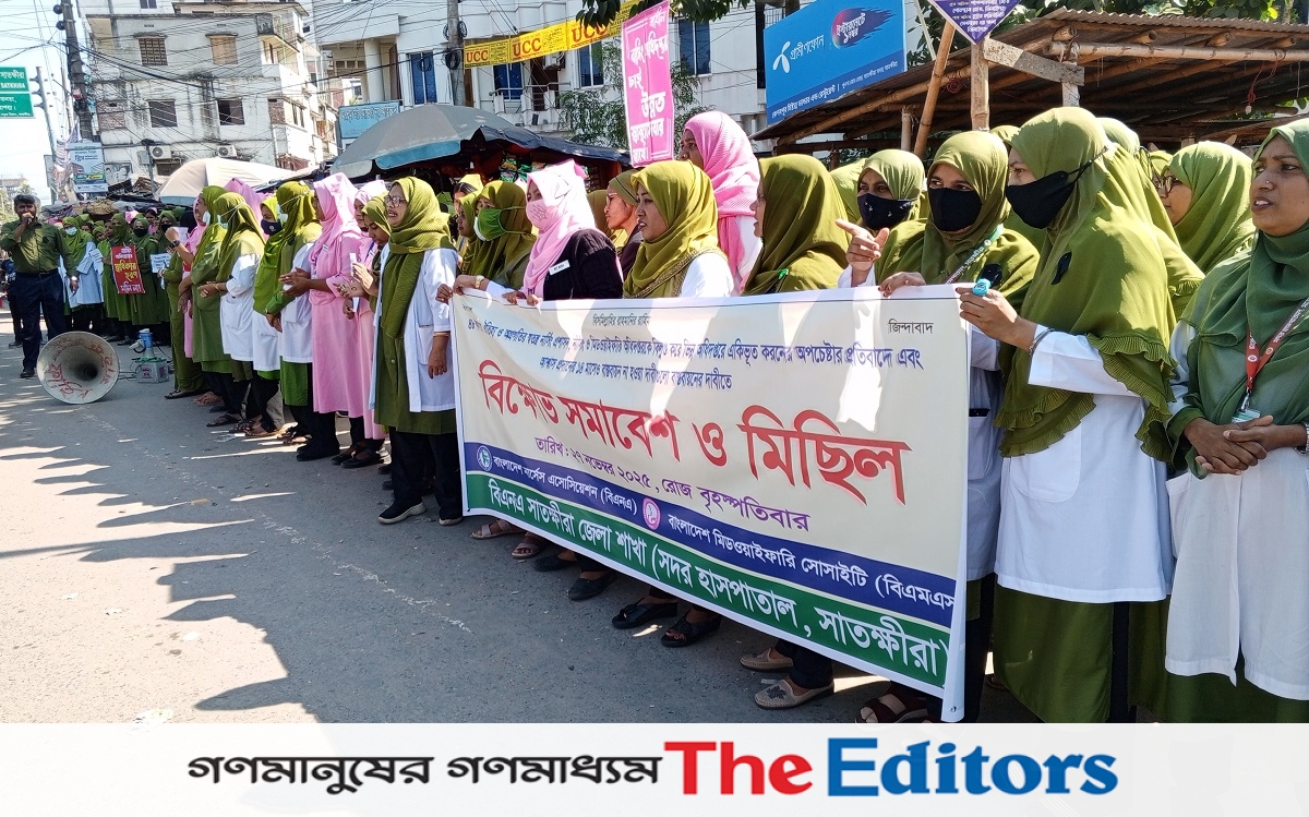 সংগঠনের সাতক্ষীরা জেলা শাখার সভাপতি ডালিয়া পারভীনের সভাপতিত্বে মানববন্ধনে বক্তব্য রাখেন, সংগঠনের সাধারণ সম্পাদক নাসিমা খাতুন, কোষাধ্যক্ষ মাহমুদুল হাসান, স্বাস্থ্য পরিদর্শক ও মিডওয়াইফারি প্রতিনিধি নাসরিন খালেদ, ছাত্র প্রতিনিধি চঞ্চলা রানী প্রমুখ।